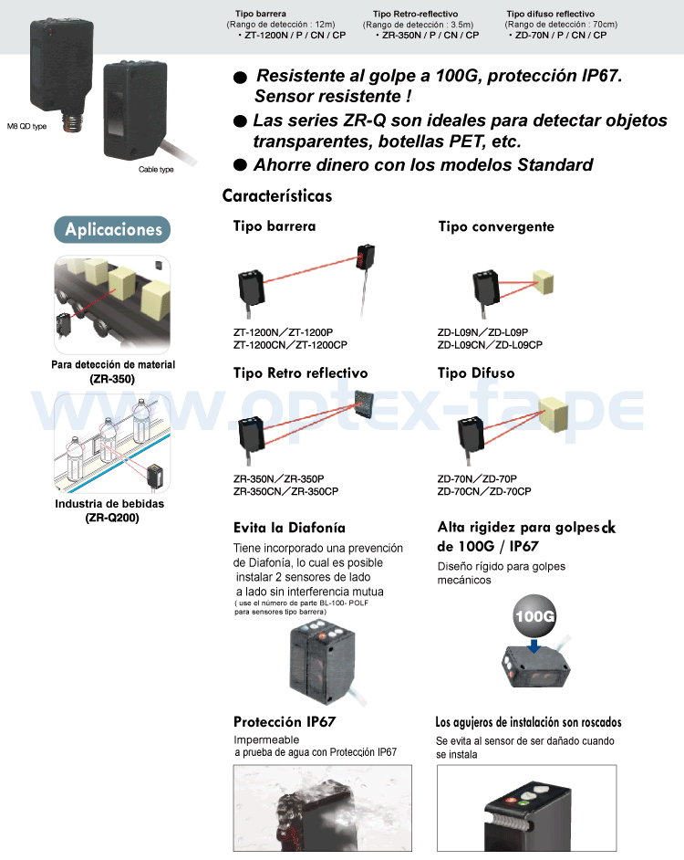 - 3 tecnologías principales: Barrera (12m), retro-reflectivo (3.6m), difuso (70cm).