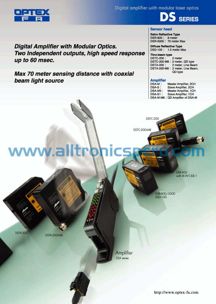 Sistema de sensores láser de alta velocidad (hasta 60ms) con amplificadores digitales configurables como maestro/esclavo. Compatible con múltiples cabezales ópticos (retrorreflectantes, difusos y thru-beam) para adaptarse a cualquier desafío de detección industrial.