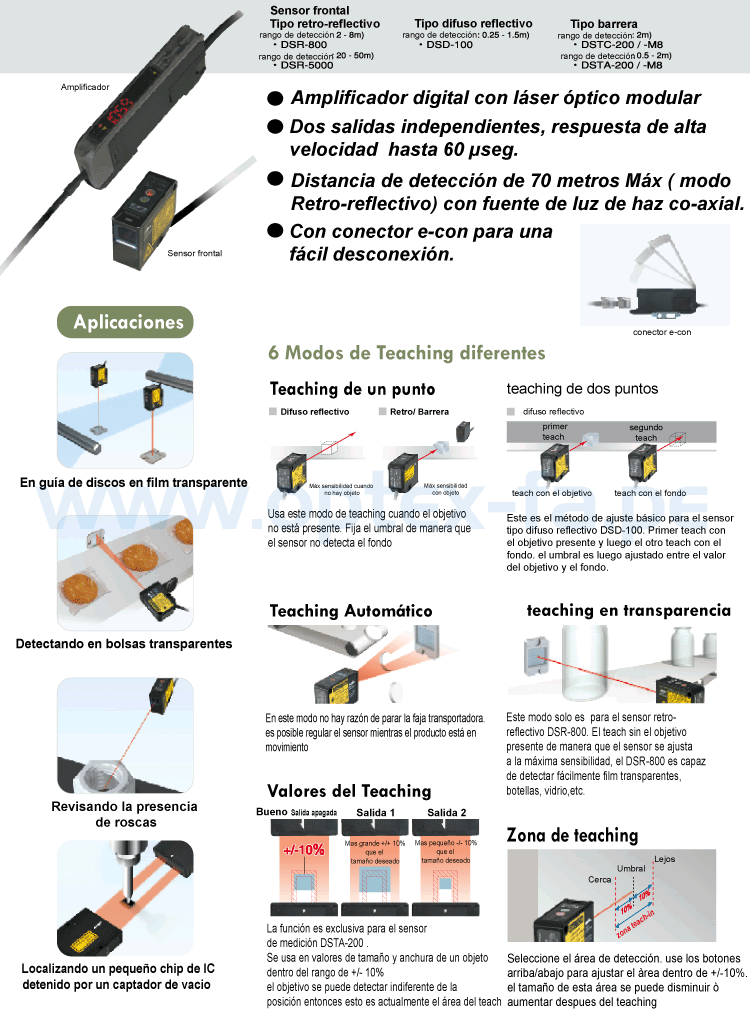- 6 modos de teaching: Automático, 2 puntos y detección en transparencia sin detener producción.