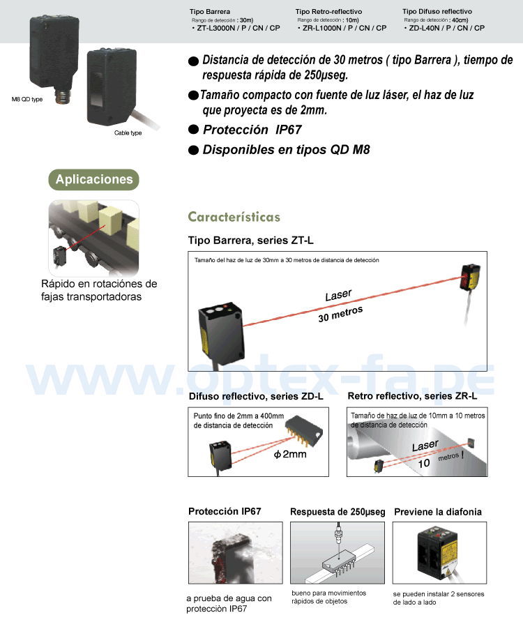 - Diseño robusto: Protección IP67 y haz láser preciso (2mm-30mm).